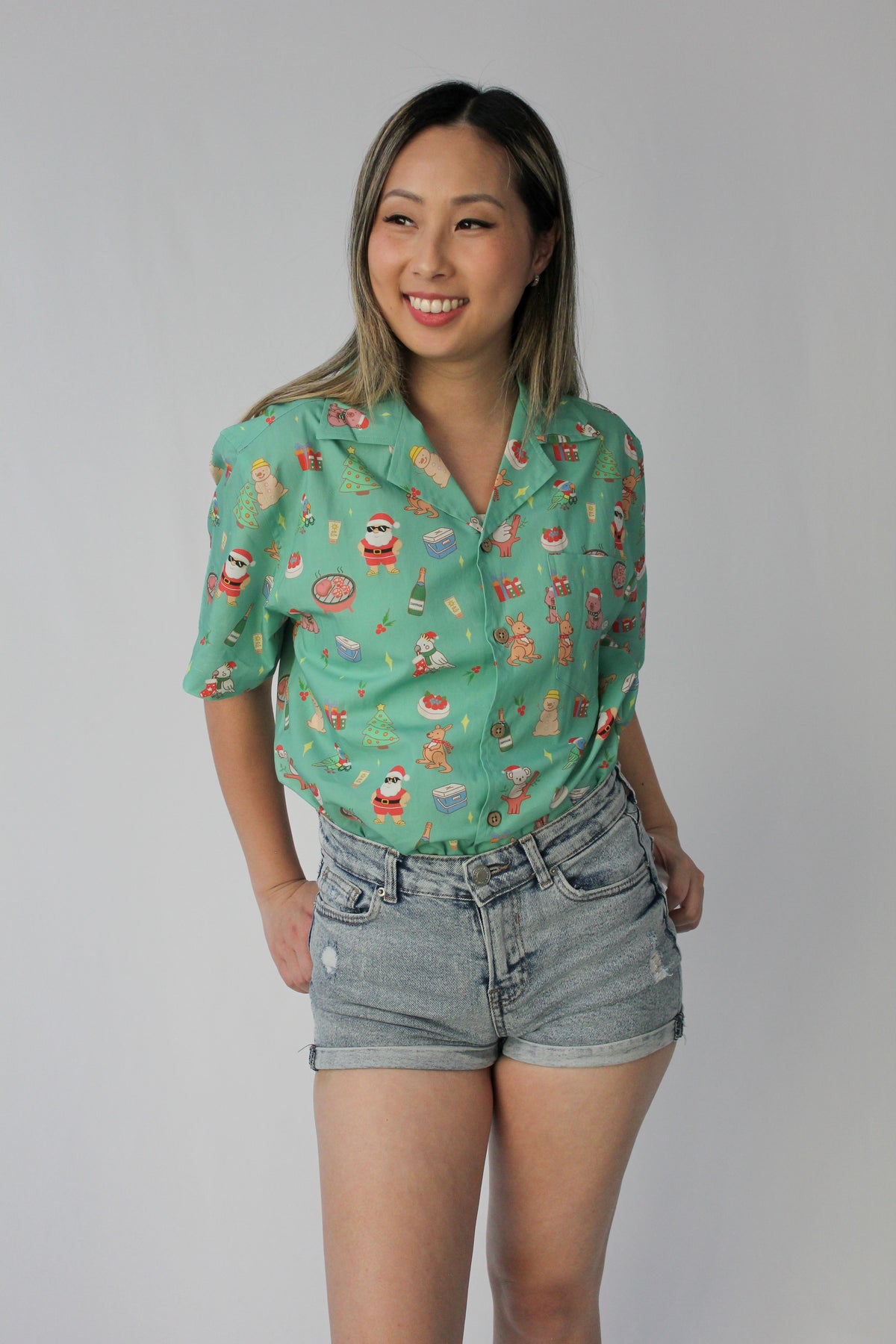 Celebrate Christmas in true Aussie summer style with our Adult Unisex Merry Mint Green Festive Shirt. Featuring nostalgic Australian festive icons on a fresh mint-green base, this lightweight button-up brings effortless holiday vibes to every warm-weather celebration.
