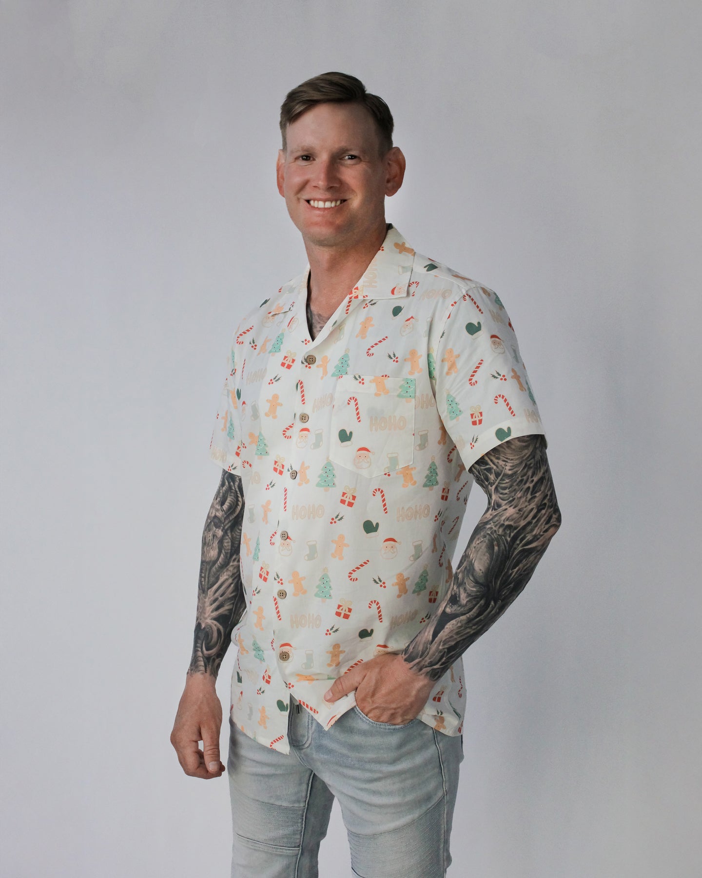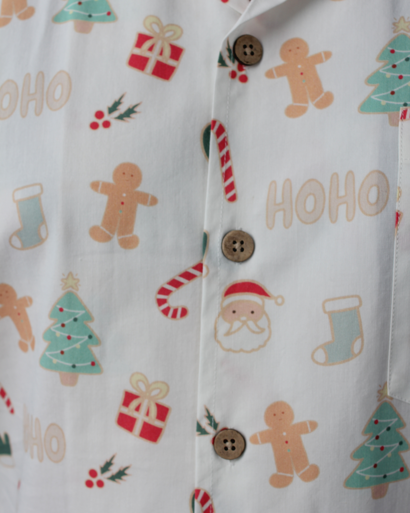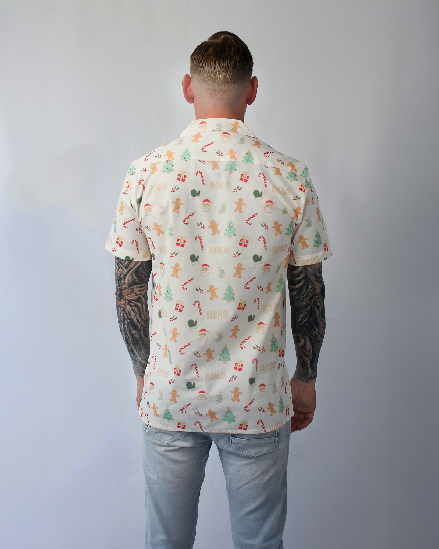 Celebrate Christmas in true Aussie summer style with our Adult Unisex Frosty White Festive Shirt. Featuring gingerbread men, candy canes and festive icons across a soft white base, this lightweight button-up brings effortless holiday vibes to every warm-weather celebration.