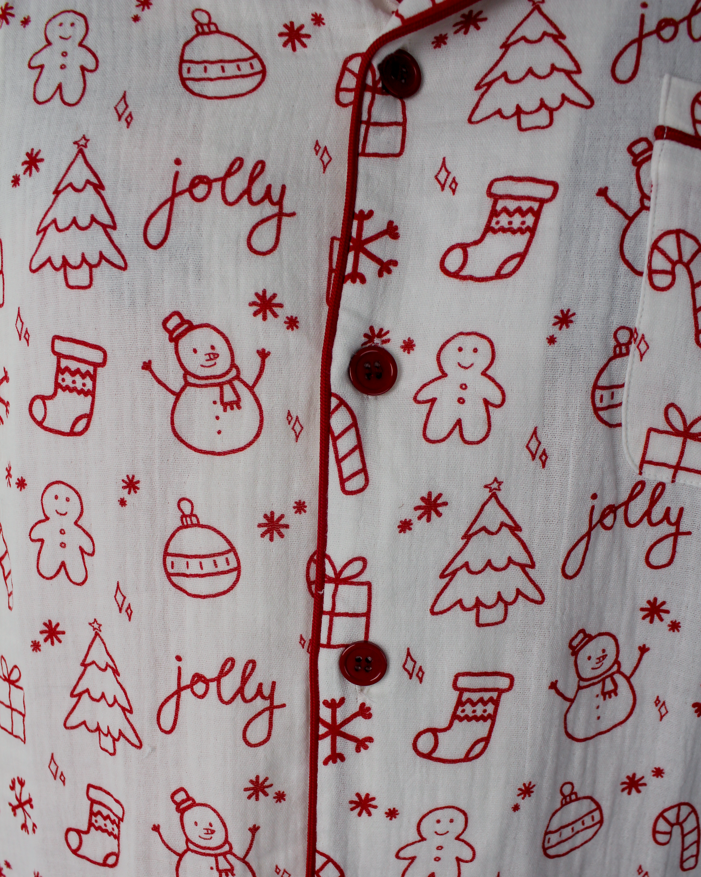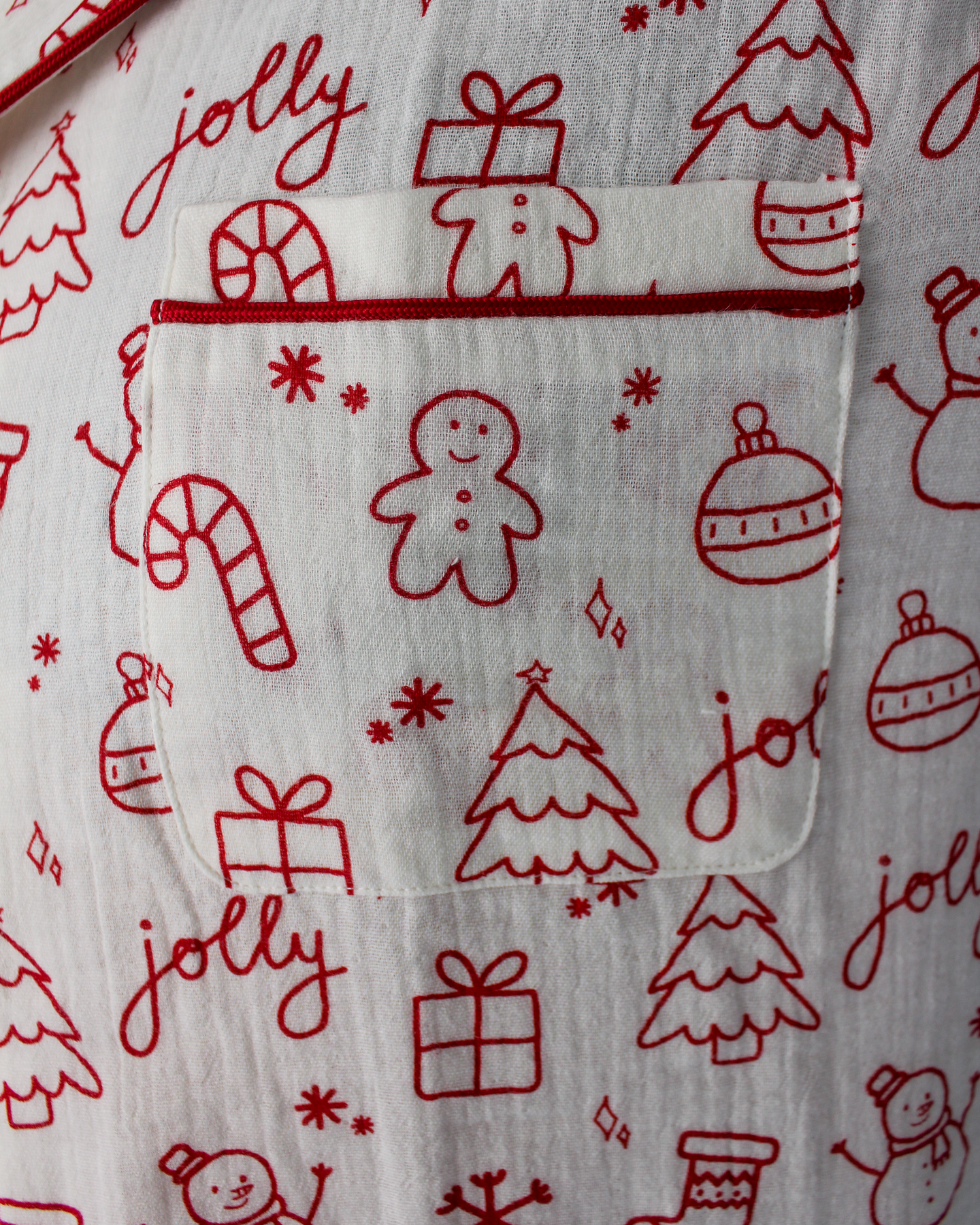 Made from 100% muslin cotton, it feels soft, airy, and perfect for the Australian summer. With a relaxed fit, short-sleeve button-up top, and matching drawstring shorts, this set is made for easy comfort from Christmas Eve to Christmas morning. You can even match with your fur babies for the full family look, with the Cherry Cheer Bandana for pets made from the same muslin cotton fabric.